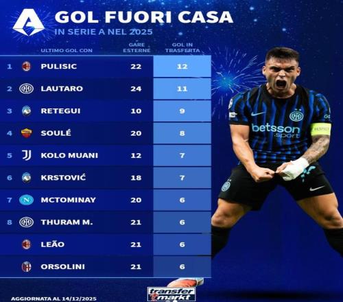 北京时间12月15日,德转列出了意甲2025年各项赛事客场比赛进球最多的10名球员,普利希奇22战打进12球排名第一,劳塔罗24战11球第二,已经离开意甲的雷特吉和科洛-穆阿尼上榜。